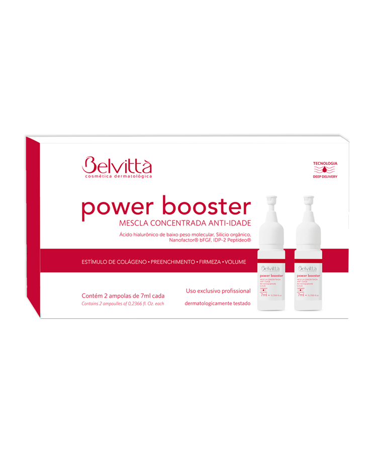 Power Booster Mescla Concentrada Anti-idade combina princípios ativos da mais avançada tecnologia que trabalham juntos para melhorar a qualidade da pele como um todo. Estimula intensamente a produção de colágeno, restaura a firmeza, fortalece as estruturas de sustentação da pele, promove preenchimento duradouro de rugas e linhas de expressão, recupera o volume e os contornos faciais de forma natural.